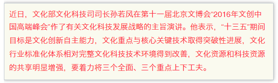 “十三五”期間我們的目標(biāo)是文化創(chuàng)新自主能力,文化重點(diǎn)與核心關(guān)鍵技術(shù)取得突破性進(jìn)展,文化行業(yè)標(biāo)準(zhǔn)化體系相對(duì)完整文化科技技術(shù)環(huán)境得到改善,文化資源和科技資源的共享明顯增強(qiáng),基本形成以市場(chǎng)為導(dǎo)向,以需求為牽引,以運(yùn)用為驅(qū)動(dòng),以文化科技企業(yè)為主體,協(xié)同創(chuàng)新、研發(fā)公關(guān)、成果轉(zhuǎn)化、區(qū)域同、人才培養(yǎng)構(gòu)成的文化創(chuàng)新體系。我們著力將三個(gè)全面、三個(gè)重點(diǎn)上下工夫。