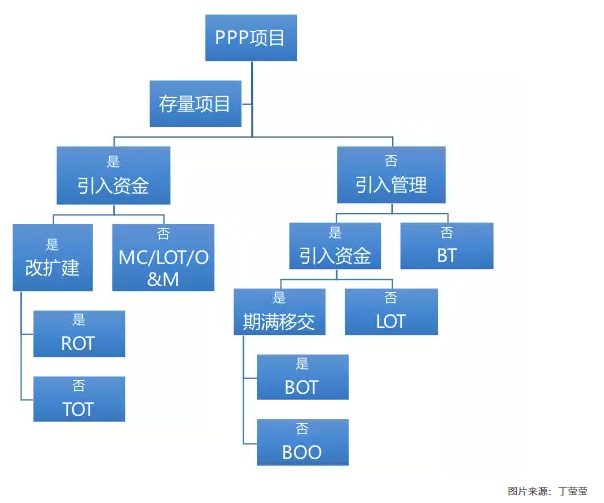 而一個PPP項目選擇合作模式可以根據(jù)是否有存量項目、是否改擴建、是否移交等方面問題選擇具體的合作模式:
