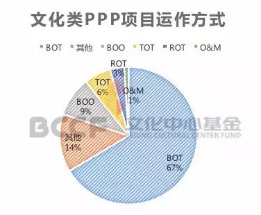 運作方式根據(jù)財政部政府與社會資本合作中心公布的資料(截至9月30日),在共計301項文化類PPP項目中,BOT項目運作方式是主流,BOO、TOT等方式也在實踐。具體而言,采用BOT方式的有200個,占比67%;采用BOO方式的有28個,占比9%;采用TOT方式的有19個,占比6%;采用ROT方式的有10個,占比3%;采用O&M方式的有3個,占比1%;采用其他方式的有41個,占比14%。
