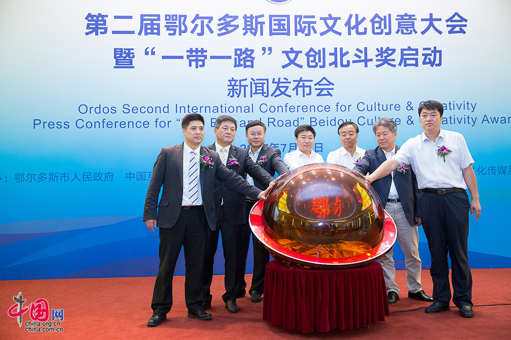 7月21日,第二屆鄂爾多斯國(guó)際文化創(chuàng)意大會(huì)暨“一帶一路”文創(chuàng)北斗獎(jiǎng)啟動(dòng)新聞發(fā)布會(huì)在北京釣魚臺(tái)國(guó)賓館召開。圖為與會(huì)嘉賓正式啟動(dòng)“一帶一路”文創(chuàng)北斗獎(jiǎng)。 中國(guó)網(wǎng) 楊佳 攝影
