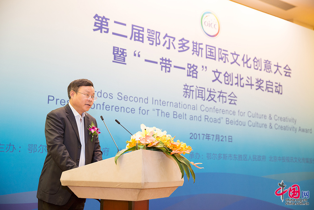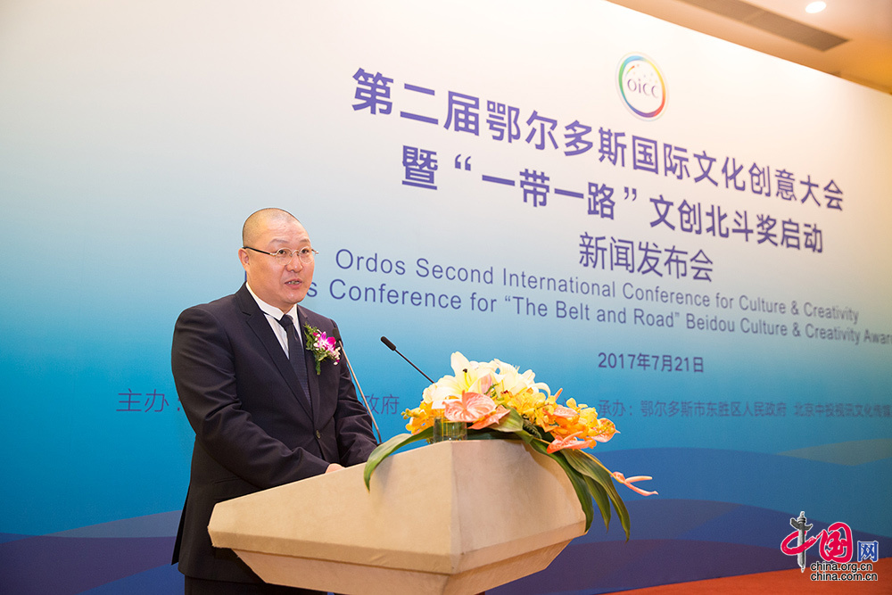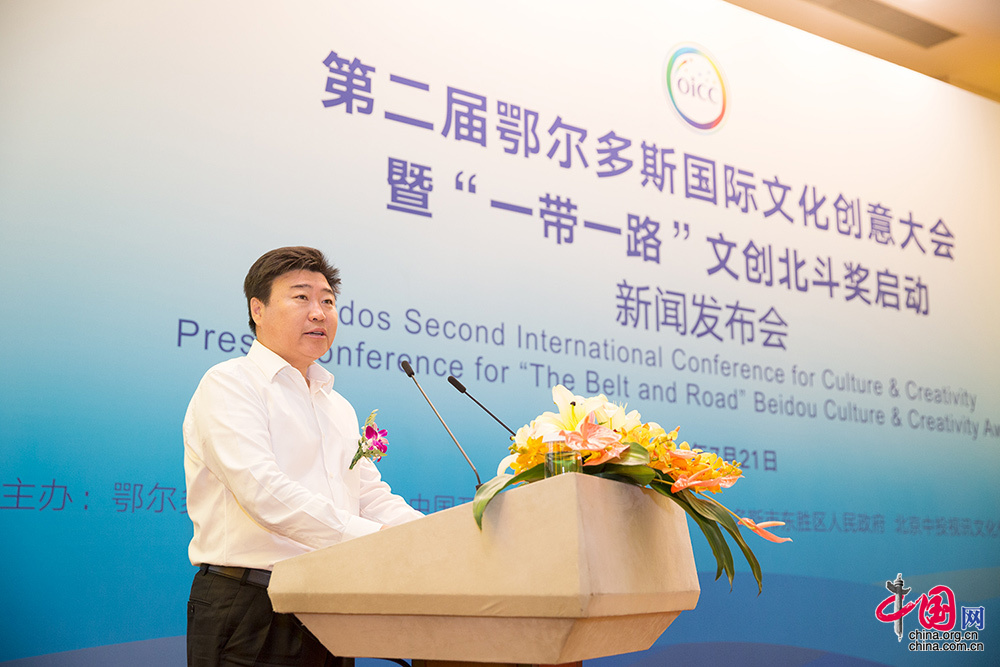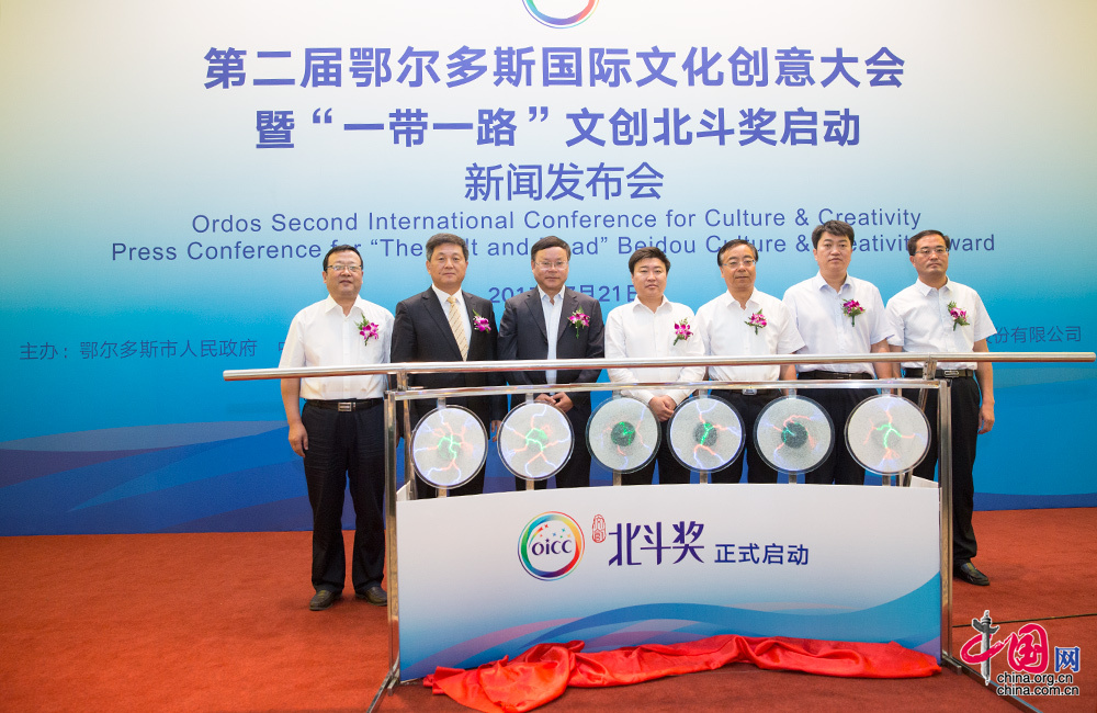 中國(guó)網(wǎng)7月21日訊(記者孫婉露 楊佳)7月21日,第二屆鄂爾多斯國(guó)際文化創(chuàng)意大會(huì)暨“一帶一路”文創(chuàng)北斗獎(jiǎng)啟動(dòng)新聞發(fā)布會(huì)隆重召開。鄂爾多斯市委副書記、市人民政府市長(zhǎng)龔明珠,市委常委、東勝區(qū)委書記于新芳,中國(guó)互聯(lián)網(wǎng)新聞中心副主任李富根等領(lǐng)導(dǎo)及北京大學(xué)文化產(chǎn)業(yè)研究院教授王齊國(guó)等嘉賓共同出席了發(fā)布會(huì)。