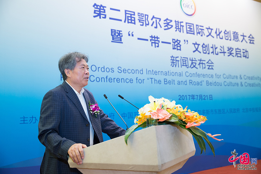 7月21日,第二屆鄂爾多斯國(guó)際文化創(chuàng)意大會(huì)暨“一帶一路”文創(chuàng)北斗獎(jiǎng)啟動(dòng)新聞發(fā)布會(huì)在北京釣魚臺(tái)國(guó)賓館召開。圖為北京大學(xué)文化產(chǎn)業(yè)研究院王齊國(guó)教授在活動(dòng)中做主旨演講。 中國(guó)網(wǎng) 楊佳 攝影