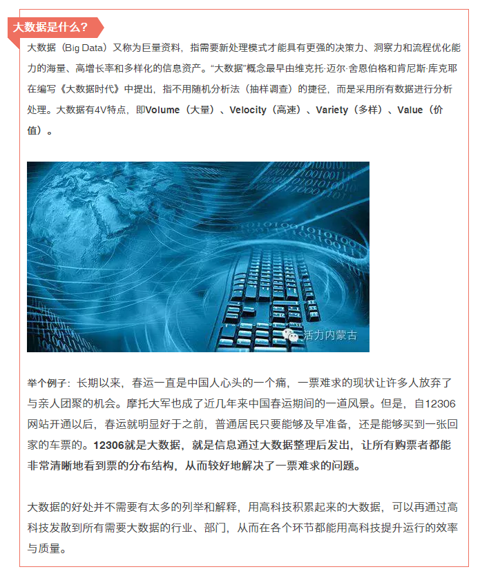 今年10月初,內蒙古入選第二批國家大數(shù)據(jù)綜合試驗區(qū),又為發(fā)展大數(shù)據(jù)產業(yè)提供了重大政策機遇。