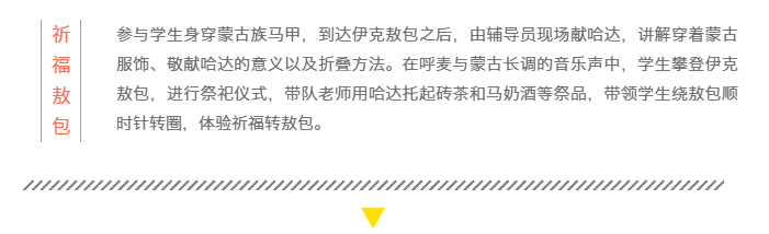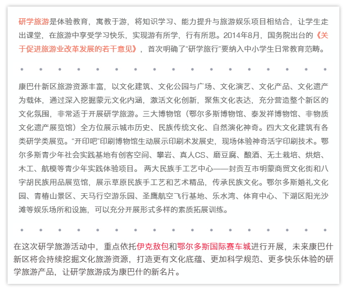 2016年10月19日-10月25日,康巴什旅游局聯(lián)合教體局、鄂爾多斯人文科技研究院、康巴什實驗小學(xué)組織的“探秘蒙元文化,感悟天驕智慧”研學(xué)旅游實踐活動正式舉辦。1400余名學(xué)生按班級分隊,在伊克敖包和鄂爾多斯國際賽車城分別開展活動,本次研學(xué)旅游活動包含了“祈福敖包、牧人大闖關(guān)、馬背上的小火車、天驕圣地寶藏、蒙古鐵騎軍、草原發(fā)明家”等六項活動。在競賽與歡笑中,參與學(xué)生不僅了解了蒙古族服飾、敖包祈福、蒙古歷史等蒙元文化,感悟成吉思汗圣地智慧,增強了地方榮譽感和自豪感,同時也塑造了團隊活力,培養(yǎng)學(xué)生的團隊合作意識。