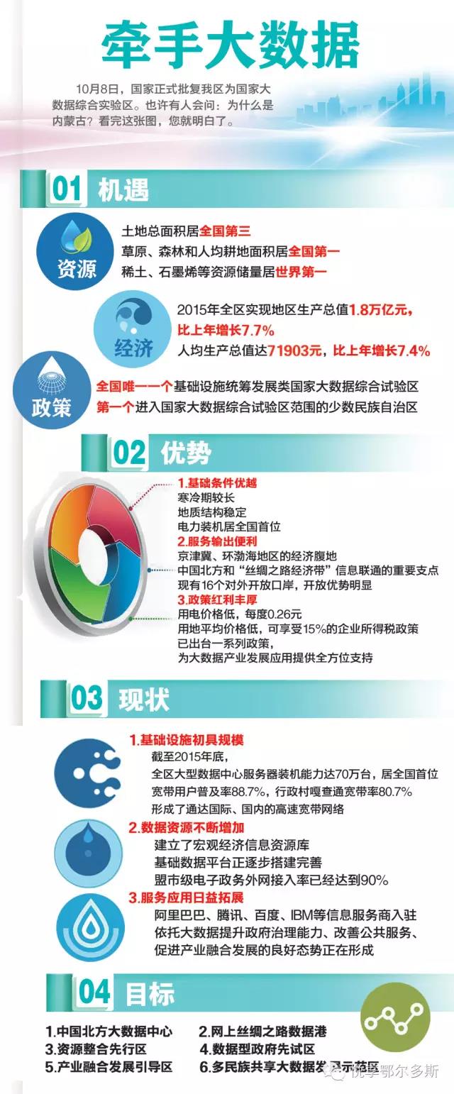 鄂爾多斯市發(fā)展大數(shù)據(jù)產(chǎn)業(yè)有著獨(dú)特的區(qū)位、氣候、地質(zhì)、電力、政策優(yōu)勢(shì)和條件。鄂爾多斯市于2009年就開(kāi)始發(fā)展云計(jì)算產(chǎn)業(yè), 2010年被內(nèi)蒙古自治區(qū)政府確定為全區(qū)云計(jì)算產(chǎn)業(yè)發(fā)展重點(diǎn)地區(qū)。2013年順應(yīng)形勢(shì),積極延伸產(chǎn)業(yè)鏈,打造云計(jì)算大數(shù)據(jù)基地。近日,國(guó)家發(fā)改委、工信部、網(wǎng)信辦聯(lián)合批復(fù)內(nèi)蒙古為全國(guó)唯一一個(gè)大數(shù)據(jù)發(fā)展綜合試驗(yàn)區(qū)。鄂爾多斯作為呼包鄂協(xié)同發(fā)展的重要一級(jí),發(fā)展大數(shù)據(jù)產(chǎn)業(yè)潛力巨大、優(yōu)勢(shì)明顯、前景看好。