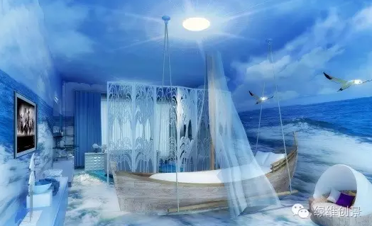 綠維浙江分院設(shè)計(jì)桃逸時(shí),大膽地將3D全息投影技術(shù)同民宿進(jìn)行無縫對(duì)接,借助3D全息投影技術(shù)模擬海上、海底和海灘的場景,投影本身內(nèi)置了真實(shí)的音效功能,可以從視覺、聽覺方面帶給客人不一樣的居住體驗(yàn)。