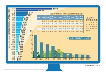 2016中國“互聯(lián)網(wǎng)+”峰會在京召開,會上揭曉了中國“互聯(lián)網(wǎng)+”建設(shè)十大標(biāo)桿城市榜單。北京、深圳、廣州和上海四個(gè)一線城市占據(jù)了榜單前四席位,杭州、成都、重慶、武漢、長沙和福州緊隨其后。