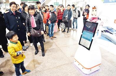 2月1日,一臺(tái)名叫“小璐”的智能機(jī)器人亮相廣州南站,吸引了大批旅客的圍觀,大家紛紛嘗試與“小璐”對(duì)話,向她咨詢列車時(shí)刻、購(gòu)票信息、天氣情況等問(wèn)題,“小璐”不僅可以用甜美的女聲一一作答,還可以在接收到語(yǔ)音指令后,為旅客“唱歌”和“跳舞”。據(jù)了解,使用智能機(jī)器人服務(wù)旅客是廣州南站在今年春運(yùn)中的新嘗試,如果試用效果良好,今后有望在車站中看到更多智能機(jī)器人的身影。圖為一位小朋友嘗試與智能機(jī)器人“小璐”對(duì)話。
