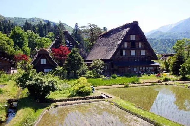 位于日本白川鄉(xiāng)的荻町,擁有114棟合掌屋。溪水蜿蜒流過(guò)的約1公里長(zhǎng)的河濱谷地上,大小不一、高矮不等的合掌屋錯(cuò)落有致地排列開(kāi)來(lái),情景蔚為壯觀。合掌屋的屋頂外型猶如兩只手掌合攏作揖,已有三四百年的歷史。木屋屋頂設(shè)計(jì)成60度銳角的正三角形,可使屋頂最大限度地承載厚重的積雪,同時(shí)讓過(guò)高的積雪自然滑落。利用就地取材的干草堆疊覆蓋屋頂以及把合掌屋建成南北朝向,也是考慮到使木屋與山脈成垂直走向,借此阻擋順著地勢(shì)刮下來(lái)的寒風(fēng),并調(diào)節(jié)日照量,使木屋冬暖夏涼。