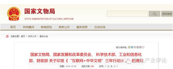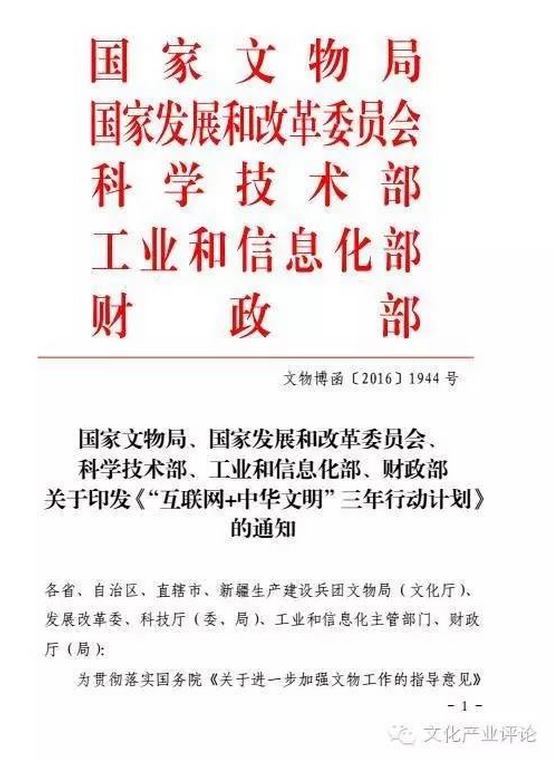 為貫徹落實(shí)國(guó)務(wù)院《關(guān)于進(jìn)一步加強(qiáng)文物工作的指導(dǎo)意見》(國(guó)發(fā)(2016)17號(hào))和《關(guān)于積極推進(jìn)“互聯(lián)網(wǎng)+”行動(dòng)的指導(dǎo)意見》(國(guó)發(fā)(2015)40號(hào)),國(guó)家文物局、國(guó)家發(fā)展和改革委員會(huì)、科學(xué)技術(shù)部、工業(yè)和信息化部、財(cái)政部共同編制了《“互聯(lián)網(wǎng)+中華文明”三年行動(dòng)計(jì)劃》?!队?jì)劃》提出到 2019 年末,初步構(gòu)建文物信息資源開放共享體系,基本形成授權(quán)經(jīng)營(yíng)、知識(shí)產(chǎn)權(quán)保護(hù)等規(guī)則規(guī)范;樹立一批具有示范性、帶動(dòng)性和影響力的融合型文化產(chǎn)品和品牌;培養(yǎng)一批高素質(zhì)人才,培育一批具有核心競(jìng)爭(zhēng)力的文博單位和骨干企業(yè);初步建立政府引導(dǎo)、社會(huì)參與、開放協(xié)作、創(chuàng)新活躍的業(yè)態(tài)環(huán)境,擴(kuò)展文物資源的社會(huì)服務(wù)功能,為滿足人民群眾多層次、多形式、多樣化的精神文化需求,促進(jìn)文化繁榮和經(jīng)濟(jì)社會(huì)發(fā)展做出新的貢獻(xiàn)。