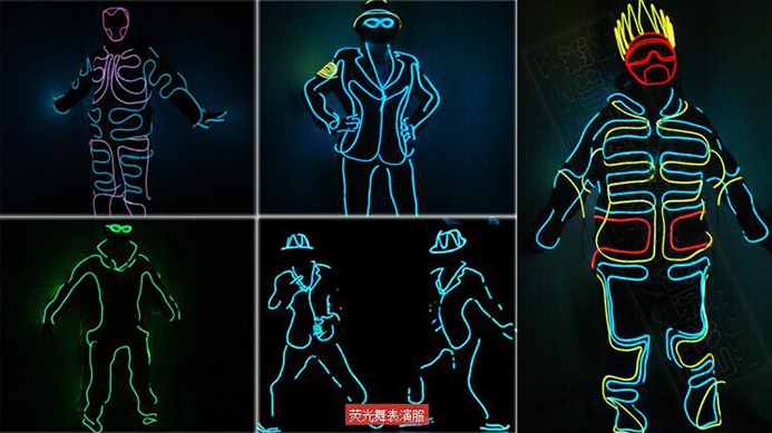 熒光舞,起源于歐美國(guó)家的派對(duì),在派對(duì)中人們利用各種熒光道具來(lái)裝點(diǎn)活動(dòng)氣氛,隨著不斷發(fā)展,熒光舞吸收了各種舞蹈所長(zhǎng),在滿足視覺(jué)上美感的同時(shí),也能帶來(lái)精神上的愉悅,觀賞熒光舞,無(wú)疑是種美的享受。熒光舞服就是表演這種創(chuàng)意舞蹈的基本道具,它主要利用一種發(fā)光材質(zhì)“ET冷光線”,把燈線縫制或黏貼到衣服上,裝上電池即可使用。