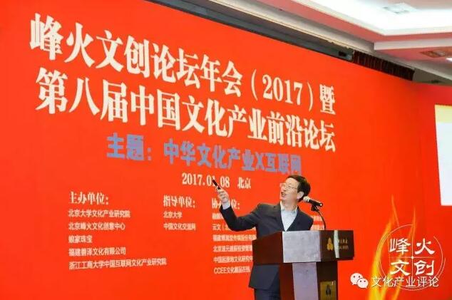 1月8日,以“中華文化產(chǎn)業(yè)X互聯(lián)網(wǎng)”為主題的,峰火文創(chuàng)論壇年會(2017)暨第八屆中國文化產(chǎn)業(yè)前沿論壇,在首都大酒店舉辦。民建中央副主席周漢民,國家行政學(xué)院原副院長周文彰,光線傳媒董事長王長田,中國文化管理協(xié)會副主席徐國寶,企鵝影視電影投資業(yè)務(wù)部總經(jīng)理常斌,北京大學(xué)文化產(chǎn)業(yè)研究院研究員、北大文化集團(tuán)總裁許曉峰,北京大學(xué)文化產(chǎn)業(yè)研究院副院長陳少峰等發(fā)表精彩演講。