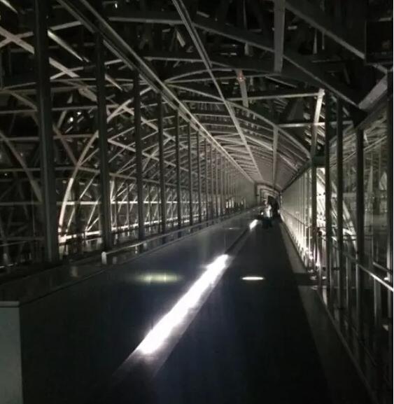 長達近三百米的連廊“掛”在60米高的鋼結(jié)構(gòu)幕墻上,非常壯觀。這條空中徑路也是目前世界上跨度最長、高度最高的半室內(nèi)空中連廊。