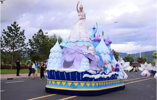 北國風光主題花車整體設計風格以冰雪公主、冰川、城堡等為主要元素,花車上可搭載互動演員,整體給人一種靚麗的感覺,萌動造型也有力提醒了游客另一面的北方森林面貌。