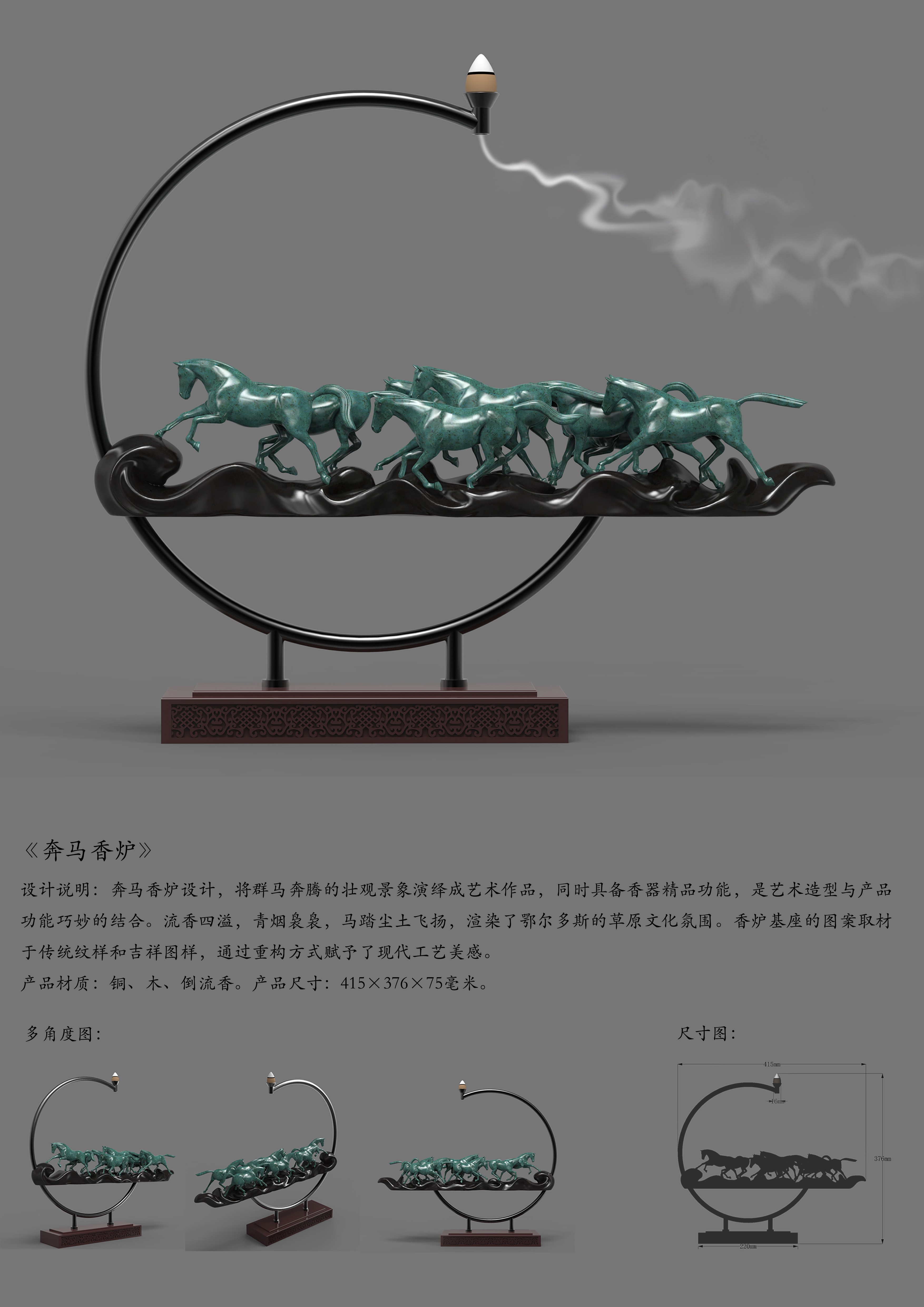 創(chuàng)作思路:奔馬香爐設(shè)計(jì),將群馬奔騰的壯觀景象演繹成藝術(shù)作品,同時(shí)具備香器精品功能,是藝術(shù)造型與產(chǎn)品功能巧妙的結(jié)合。流香四溢,青煙裊裊,馬踏塵土飛揚(yáng),渲染了鄂爾多斯的草原文化氛圍。香爐基座的圖案取材于傳統(tǒng)紋樣和吉祥圖樣,通過(guò)重構(gòu)方式賦予了現(xiàn)代工藝美感。