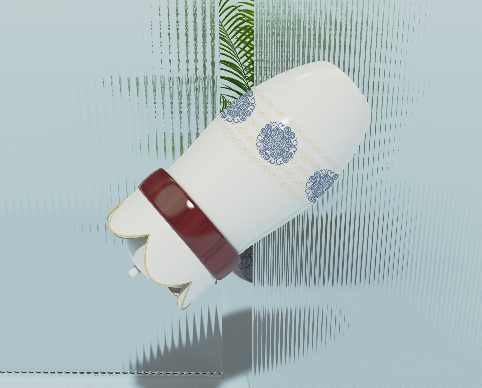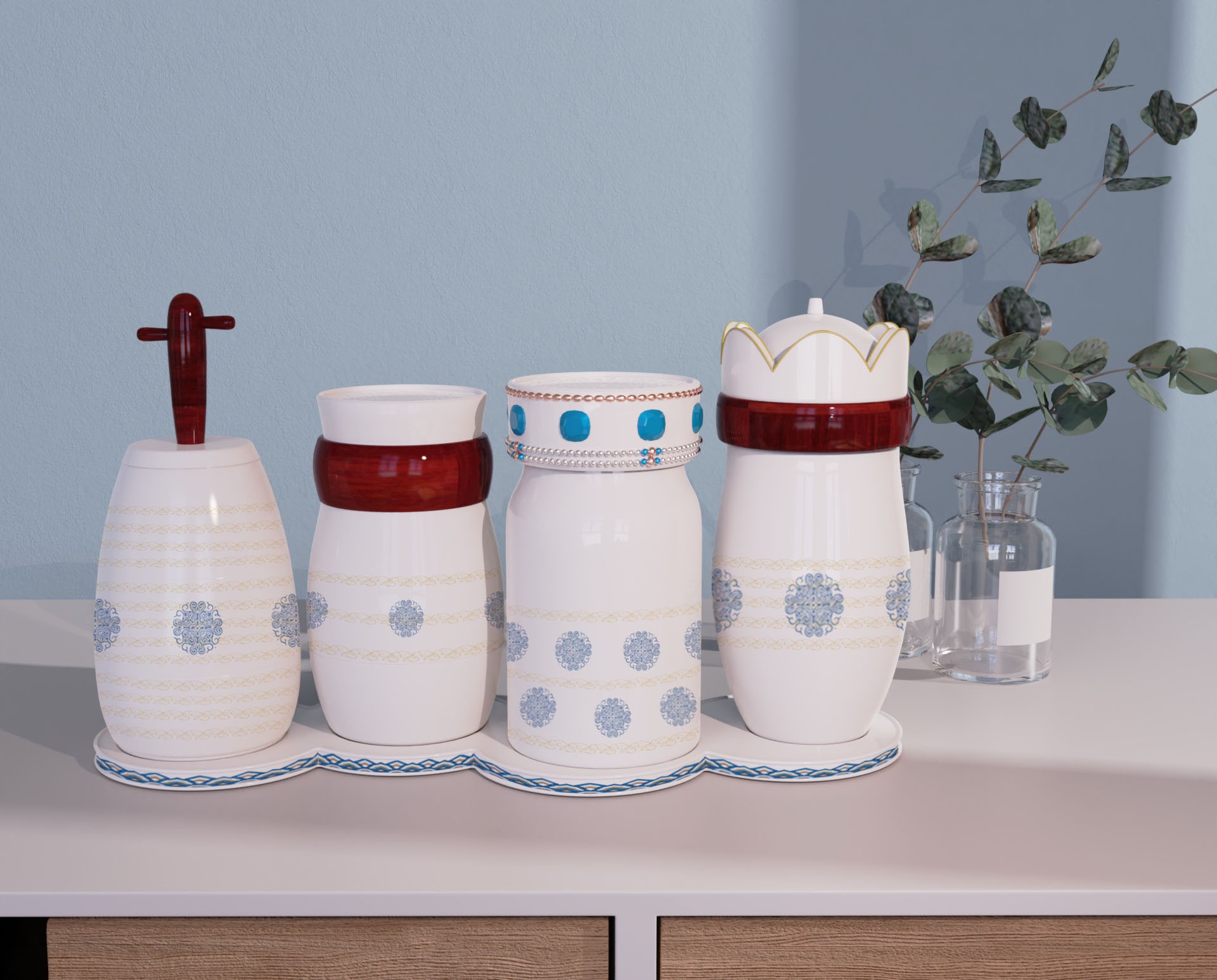 設計說明:鄂爾多斯婚禮已經(jīng)流傳了 700 多年,有著獨特的民族特色,濃郁的生活氣息,悠揚的歌舞形式和熱烈隆重的場面。該款廚房調(diào)味瓶“夢中情緣”就是基于鄂爾多斯婚禮這一場景進行設計的,其中包括了鄂爾多斯新娘頭飾、男式冠帽、冬不拉等設計元素,來展現(xiàn)鄂爾多斯婚禮盛大場面,表達了鄂爾多斯人民追求幸福生活的美好愿望。