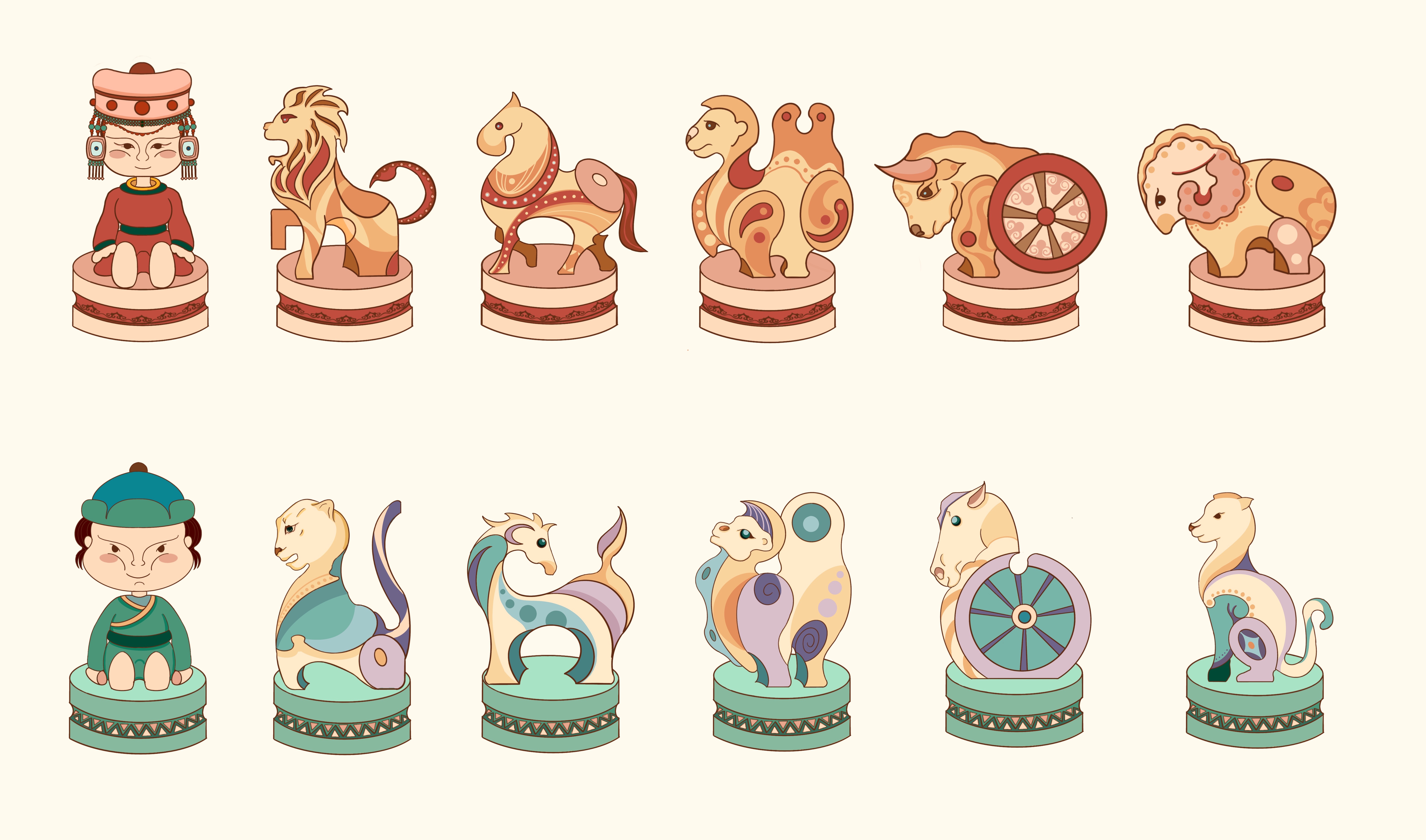 創(chuàng)作思路:以內(nèi)蒙古傳統(tǒng)象棋為創(chuàng)作依據(jù),將棋子形象化、生動化。