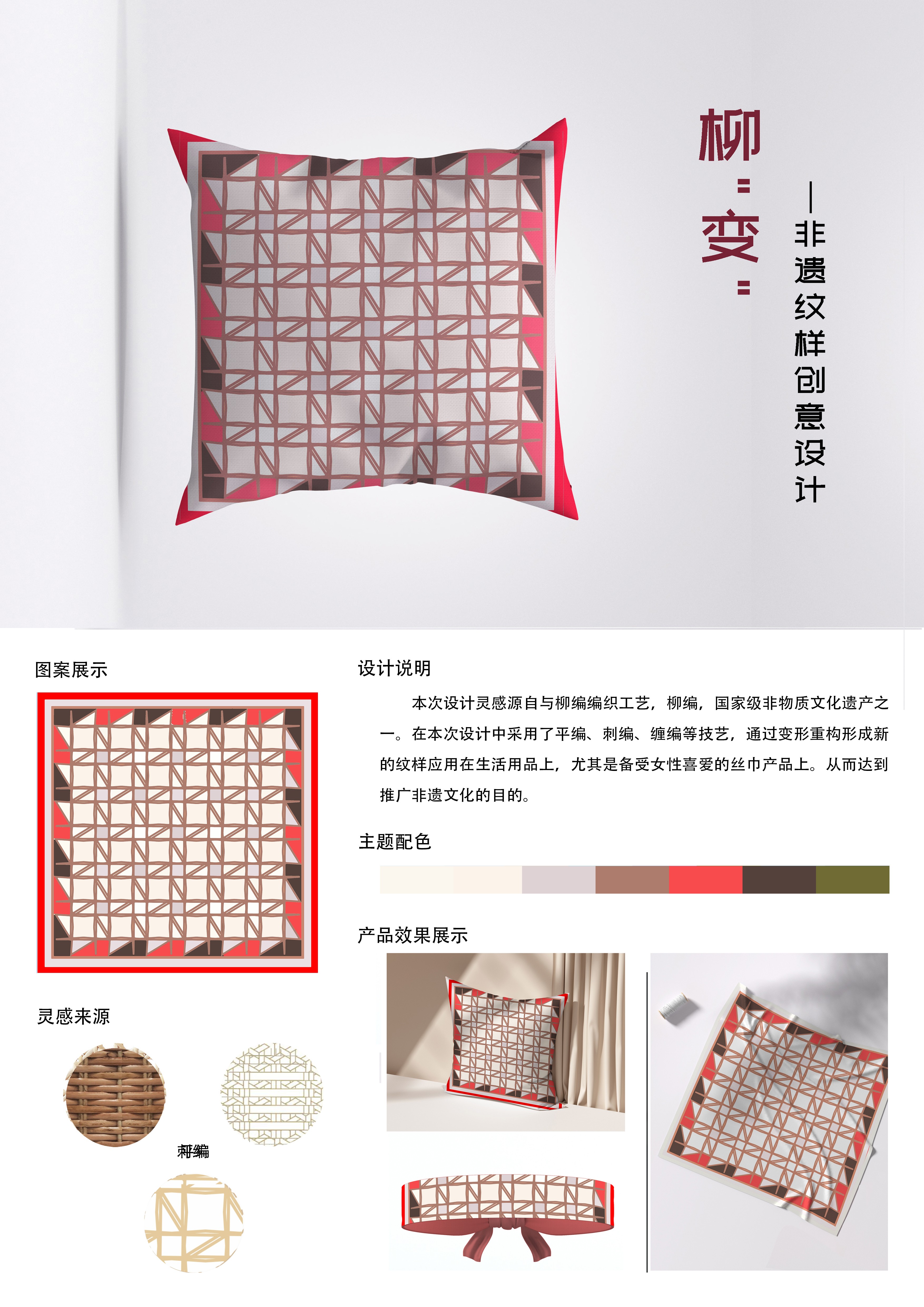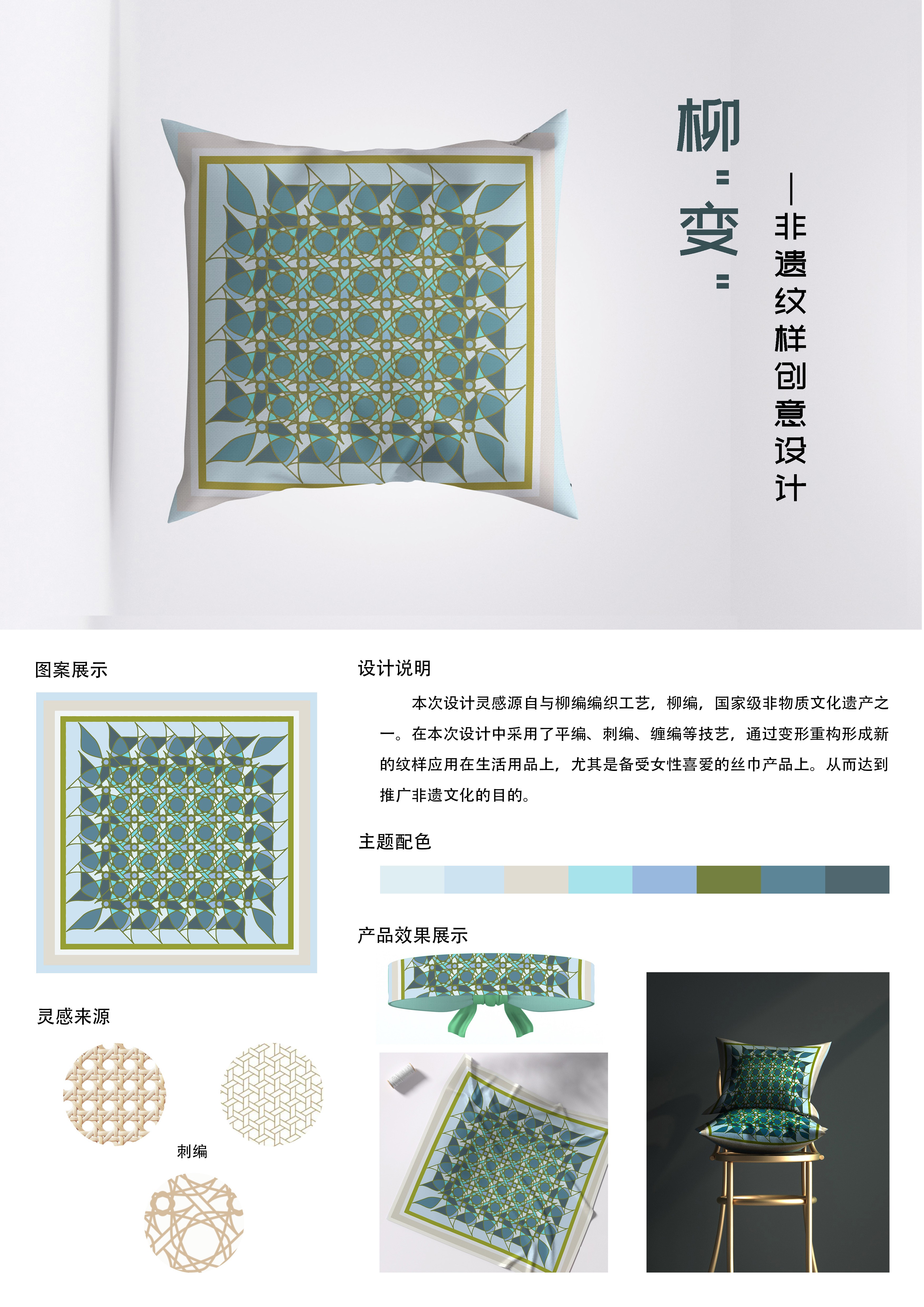 創(chuàng)作思路:本次設(shè)計(jì)靈感源自與柳編編織工藝,柳編,國家級(jí)非物質(zhì)文化遺產(chǎn)之一。在本次設(shè)計(jì)中采用了平編、刺編、纏編等技藝,通過變形重構(gòu)形成新的紋樣應(yīng)用在生活用品上,尤其是備受女性喜愛的絲巾產(chǎn)品上。從而達(dá)到推廣非遺文化的目的。