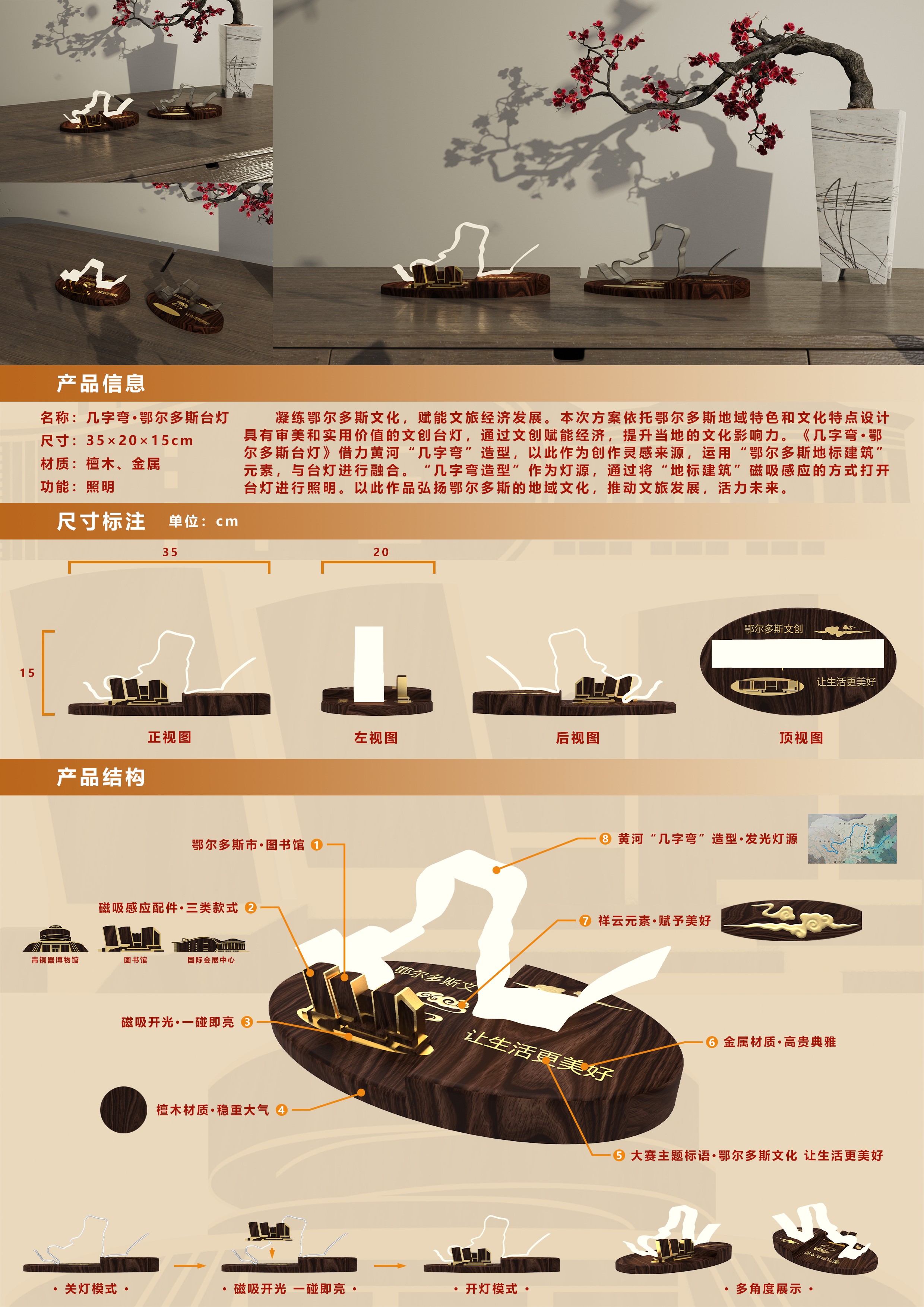 凝練鄂爾多斯文化,賦能文旅經(jīng)濟(jì)發(fā)展。本次方案依托鄂爾多斯地域特色和文化特點(diǎn)設(shè)計(jì)具有審美和實(shí)用價(jià)值的文創(chuàng)臺(tái)燈,通過(guò)文創(chuàng)賦能經(jīng)濟(jì),提升當(dāng)?shù)氐奈幕绊懥Α!稁鬃謴潯ざ鯛柖嗨古_(tái)燈》借力黃河“幾字彎”造型,以此作為創(chuàng)作靈感來(lái)源,運(yùn)用“鄂爾多斯地標(biāo)建筑”元素,與臺(tái)燈進(jìn)行融合。“幾字彎造型”作為燈源,通過(guò)將“地標(biāo)建筑”磁吸感應(yīng)的方式打開(kāi)臺(tái)燈進(jìn)行照明。以此作品弘揚(yáng)鄂爾多斯的地域文化,推動(dòng)文旅發(fā)展,活力未來(lái)。