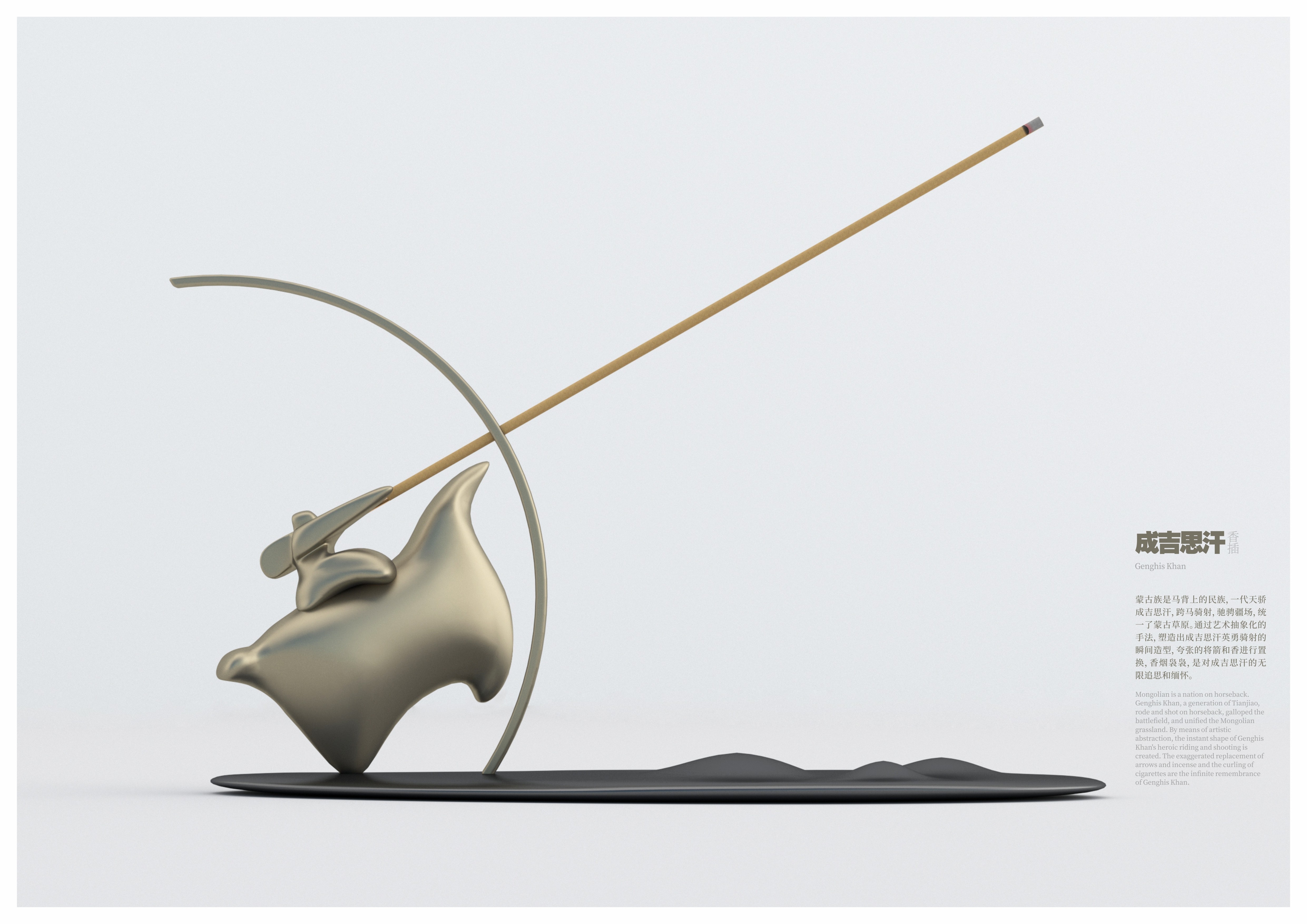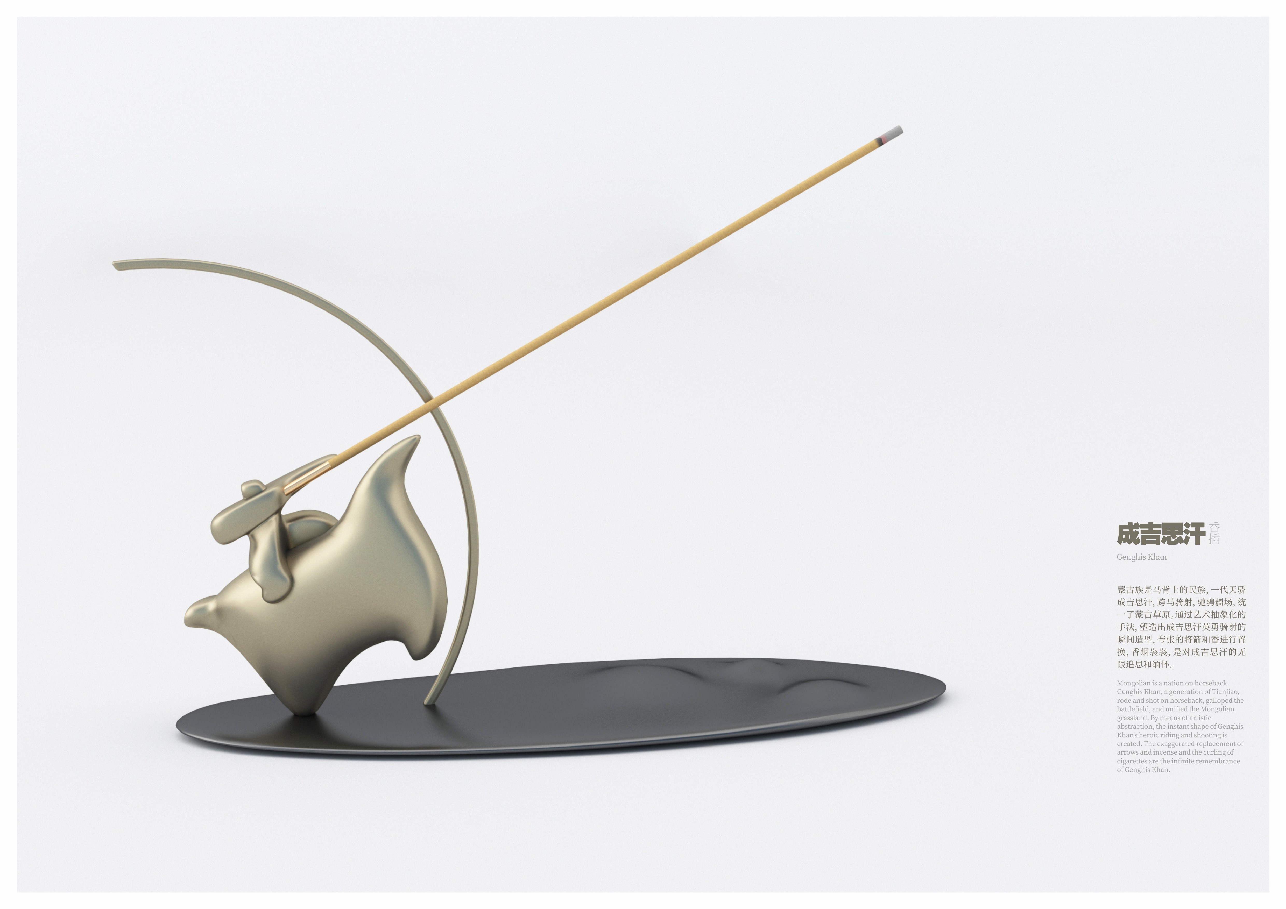 創(chuàng)作思路:蒙古族是馬背上的民族,一代天驕成吉思汗,跨馬騎射,馳騁疆場,統(tǒng)一了蒙古草原。通過藝術(shù)抽象化的手法,塑造出成吉思汗英勇騎射的瞬間造型,將箭和香進行置換,香煙裊裊,是對成吉思汗的無限追思和緬懷。