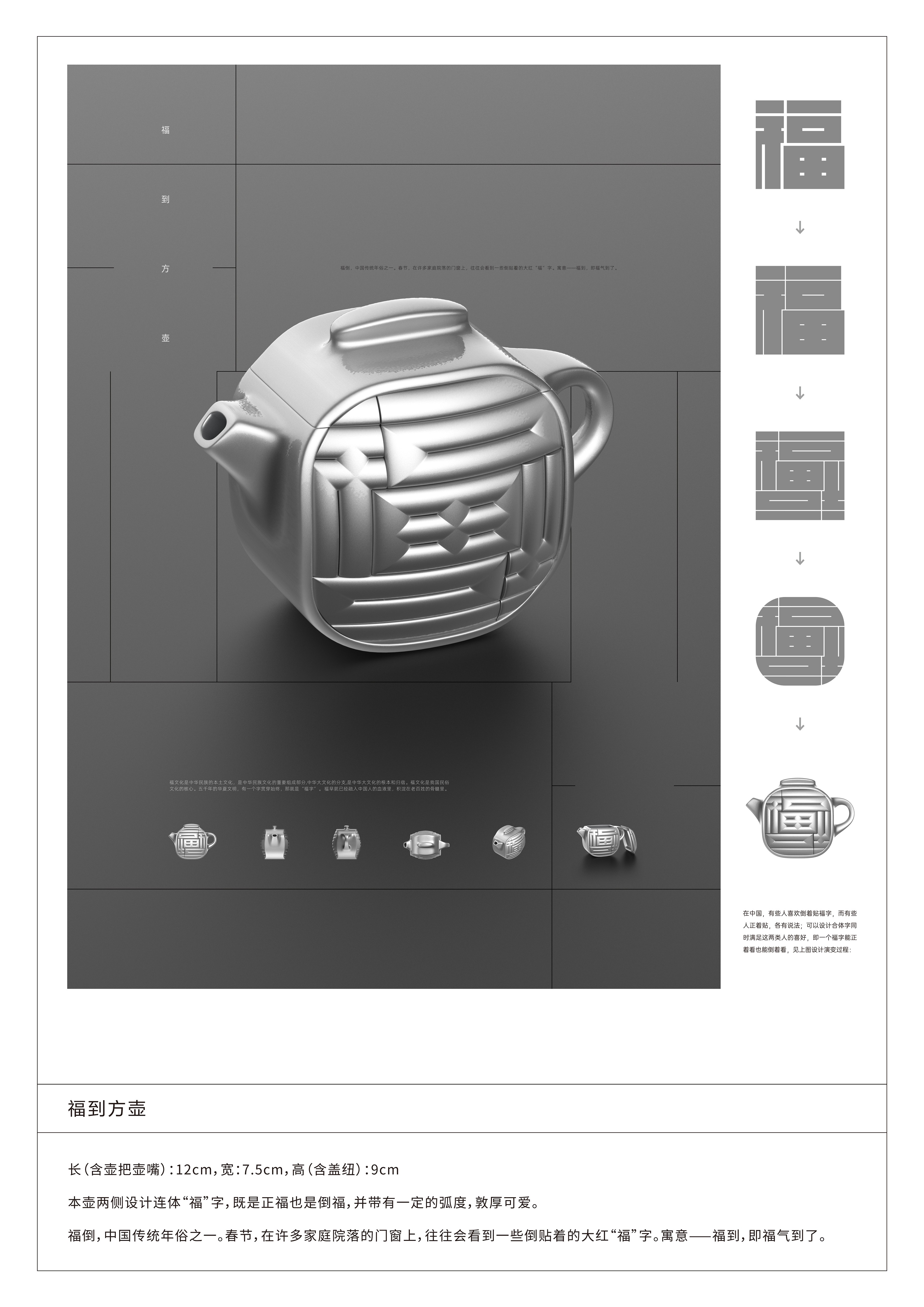 創(chuàng)作思路:本銀壺兩側設計連體“福”字,既是正福也是倒福,并帶有一定的弧度,敦厚可愛