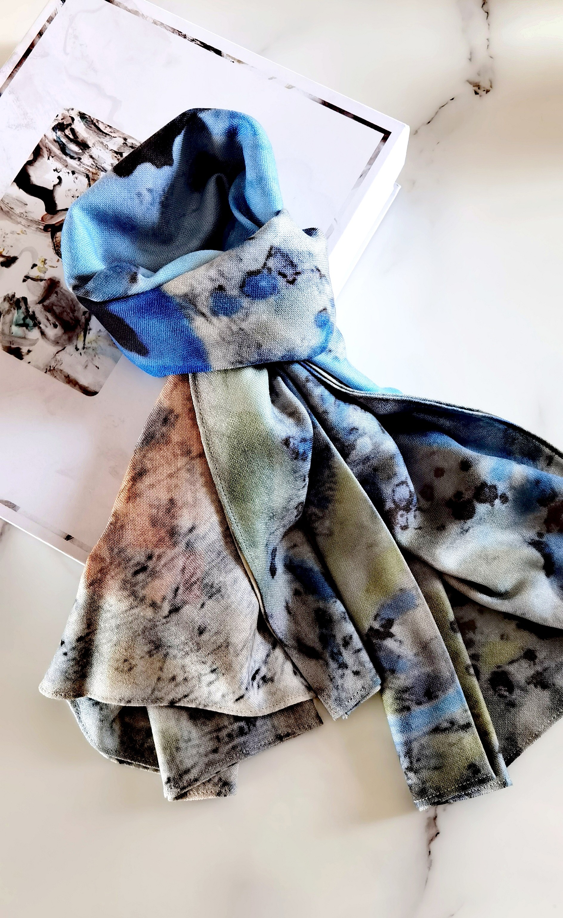 設(shè)計理念:以畫作設(shè)計成羊絨披肩,是畫家心情的真實表達(dá)和率性而作。