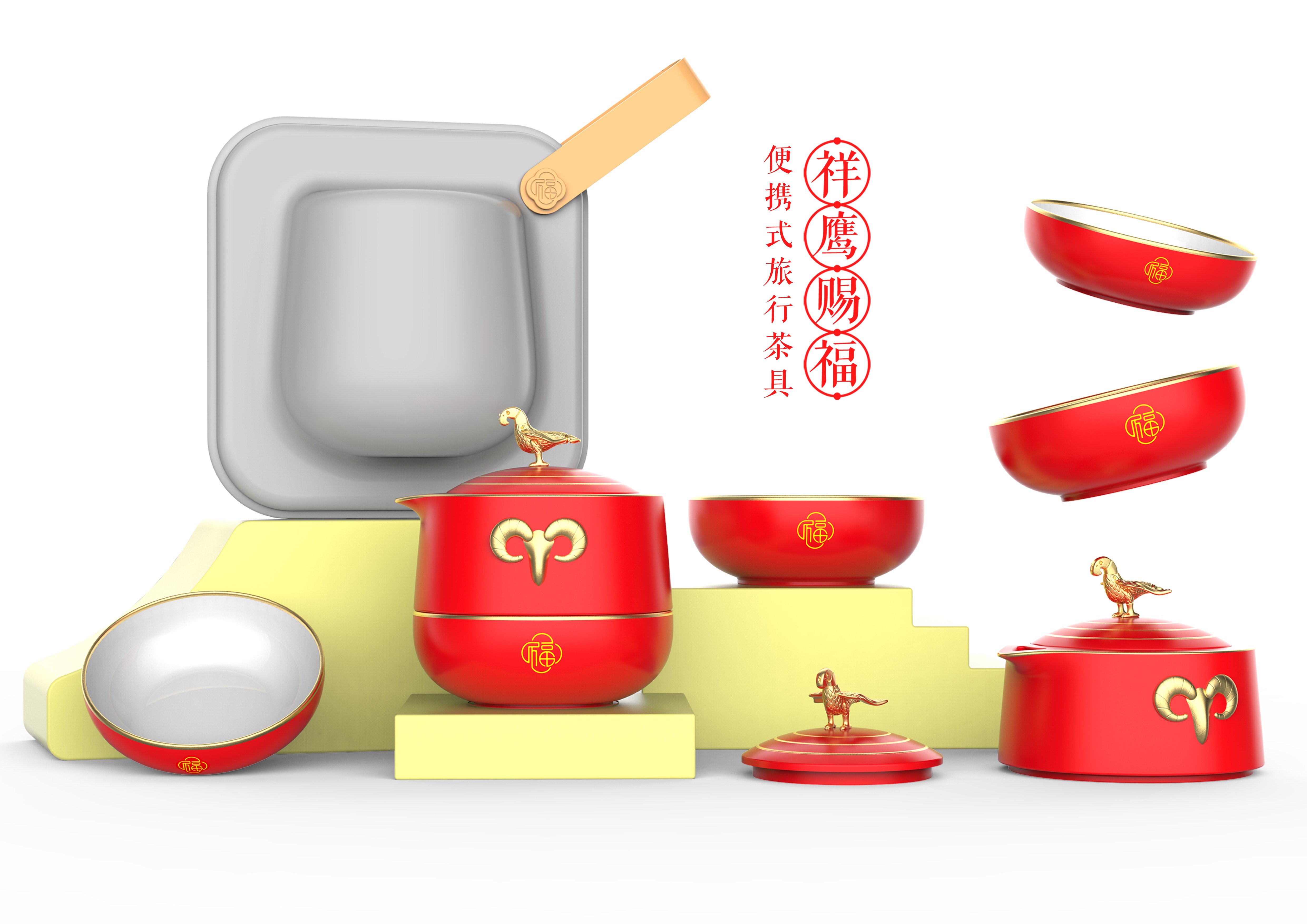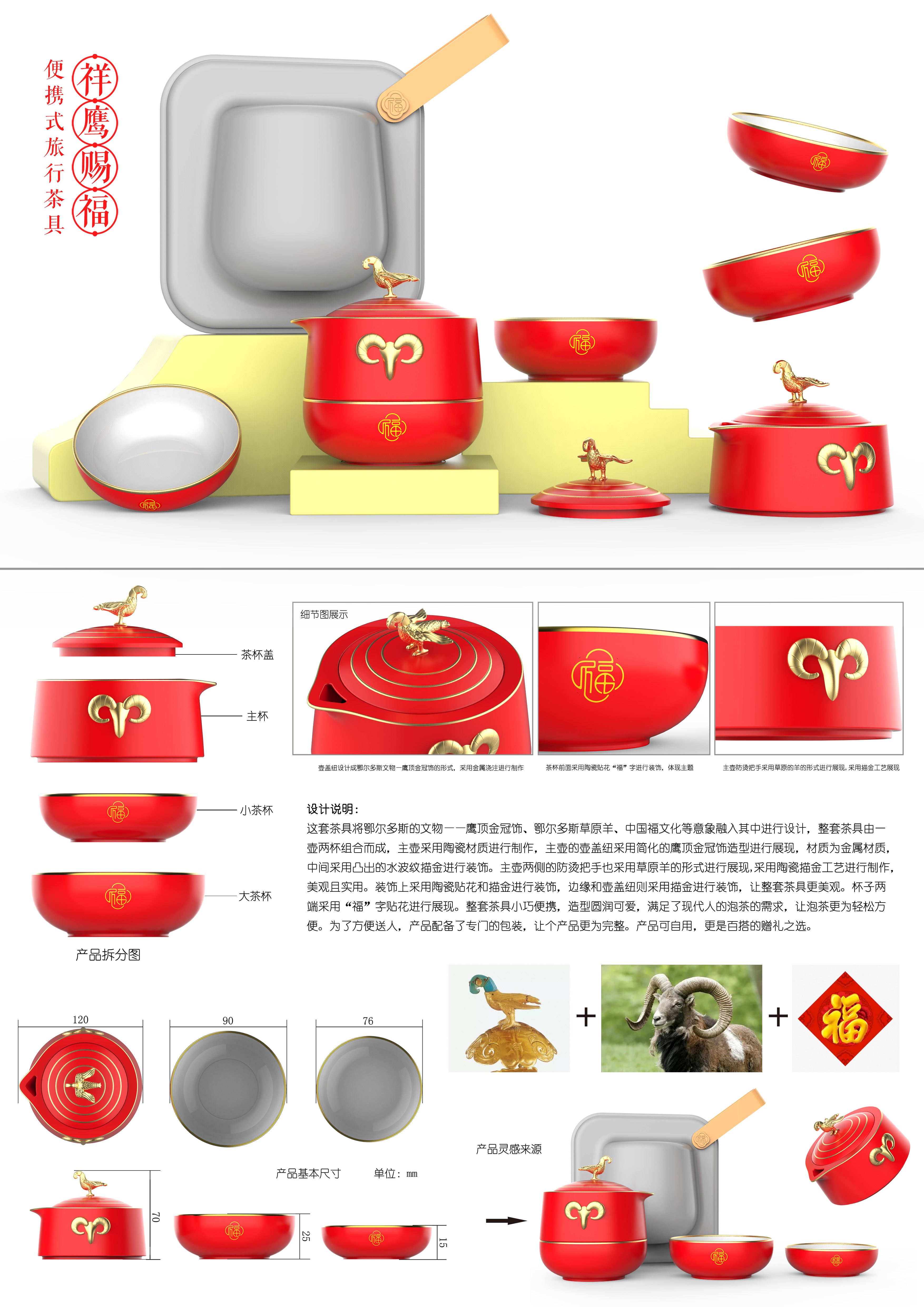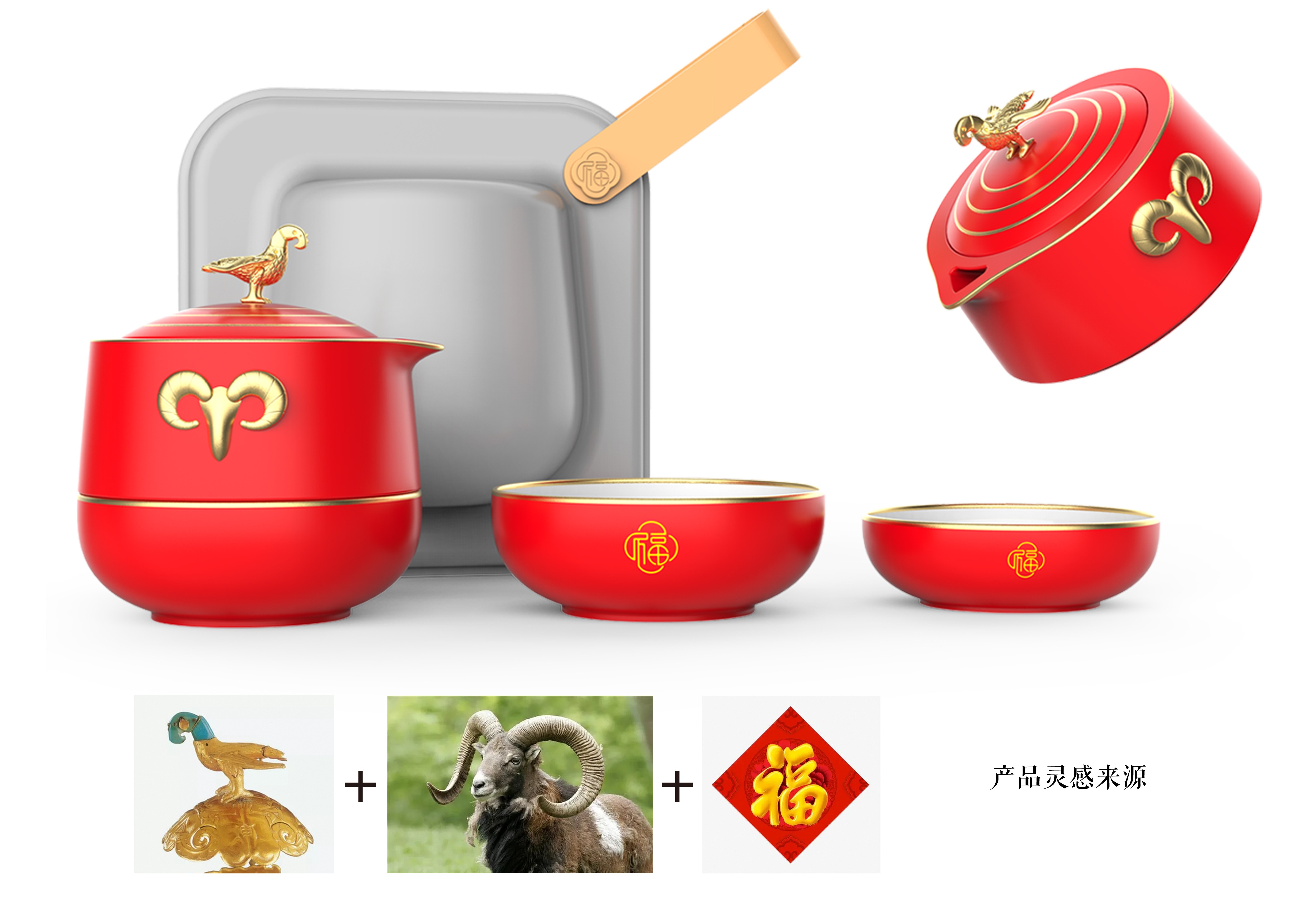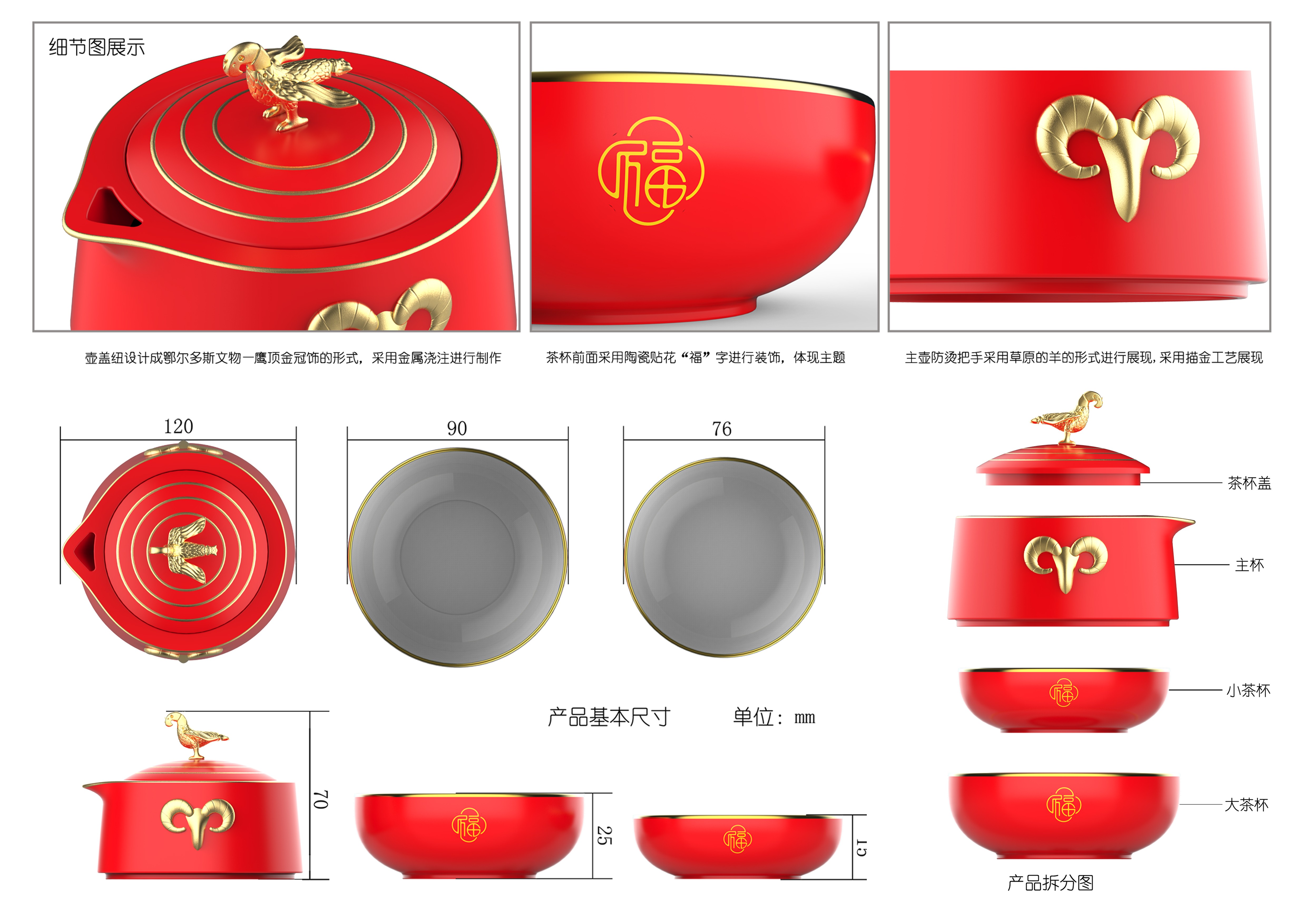 創(chuàng)作思路:這套茶具將鄂爾多斯的文物鷹頂金冠飾、鄂爾多斯草原羊、中國福文化等意象融入其中進(jìn)行設(shè)計(jì),整套茶具由一壺兩杯組合而成,主壺采用陶瓷材質(zhì)進(jìn)行制作,主壺的壺蓋紐采用簡化的鷹頂金冠飾造型進(jìn)行展現(xiàn),材質(zhì)為金屬材質(zhì),中間采用凸出的水波紋描金進(jìn)行裝飾。主壺兩側(cè)的防燙把手也采用草原羊的形式進(jìn)行展現(xiàn),采用陶瓷描金工藝進(jìn)行制作,美觀且實(shí)用。裝飾上采用陶瓷貼花和描金進(jìn)行裝飾,邊緣和壺蓋紐則采用描金。