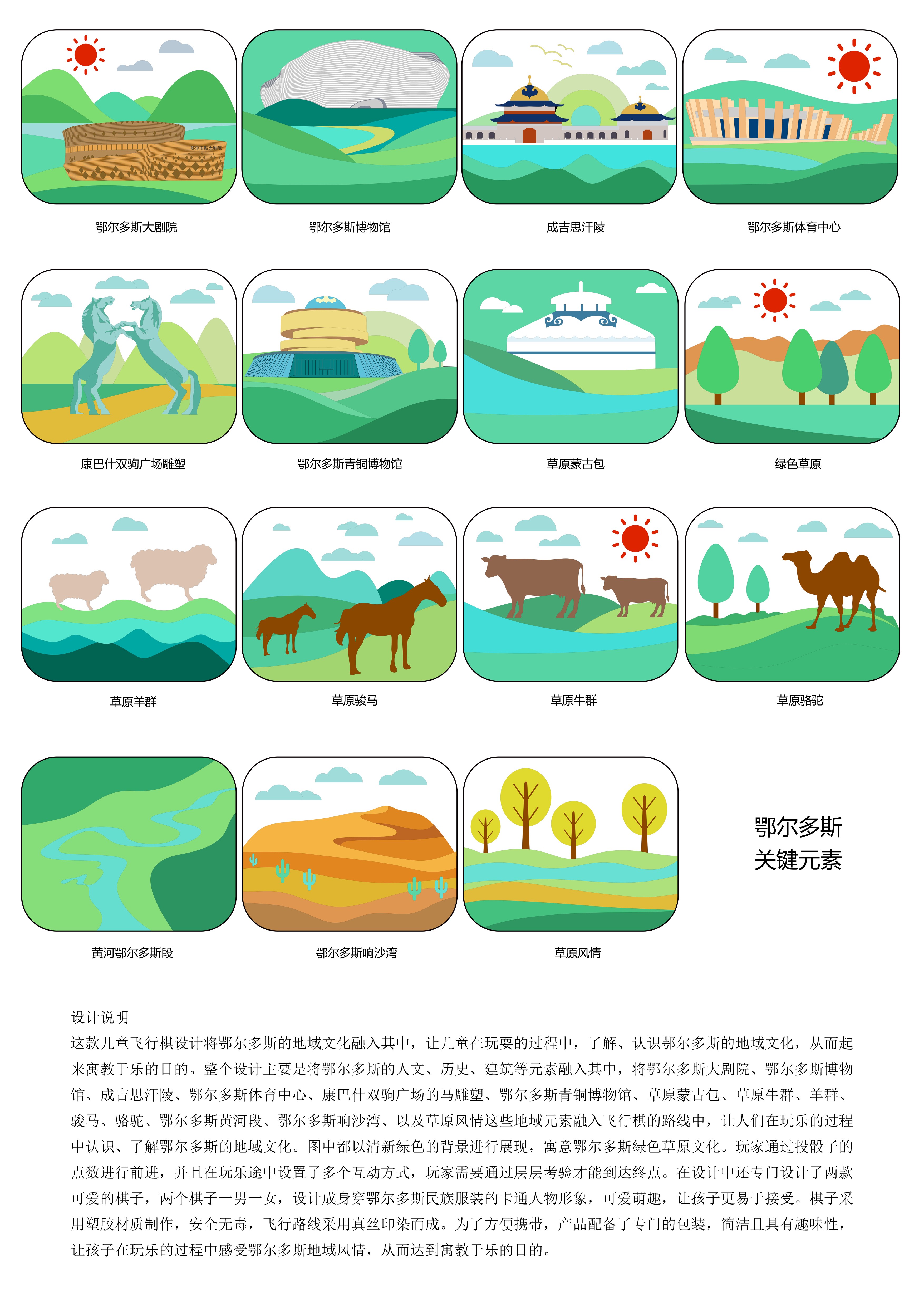 創(chuàng)作思路:這款兒童飛行棋設(shè)計(jì)將鄂爾多斯的地域文化融入其中,讓兒童在玩耍的過程中,了解、認(rèn)識(shí)鄂爾多斯的地域文化,從而起