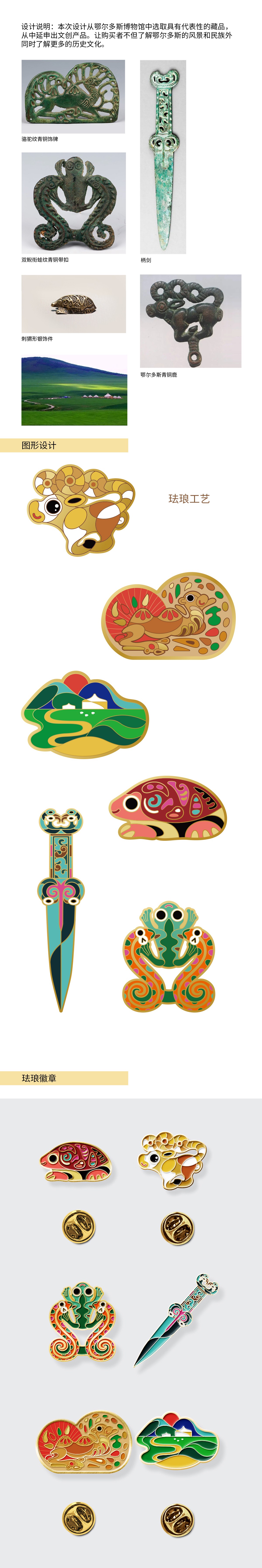 創(chuàng)作思路:將鄂爾多斯的歷史人文等元素結(jié)合。從鄂爾多斯博物館中的青銅器如手,創(chuàng)新設(shè)計(jì),加入更多新鮮元素,讓現(xiàn)代的人更好的接受。設(shè)計(jì)時(shí)選用琺瑯+皮革的鑰匙扣、金屬鏤空書(shū)簽、和琺瑯胸針這幾個(gè)方向來(lái)展現(xiàn)。在日常使用時(shí)十分實(shí)用。自用和送禮都非常有意義。