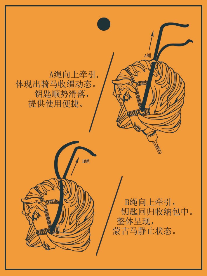 設(shè)計(jì)理念:將騎馬收韁的動(dòng)態(tài)應(yīng)用于產(chǎn)品之中,除收納功能以外,在一拉一收中體會(huì)騎馬的樂趣。輸出蒙古馬精神,弘揚(yáng)地域文化。