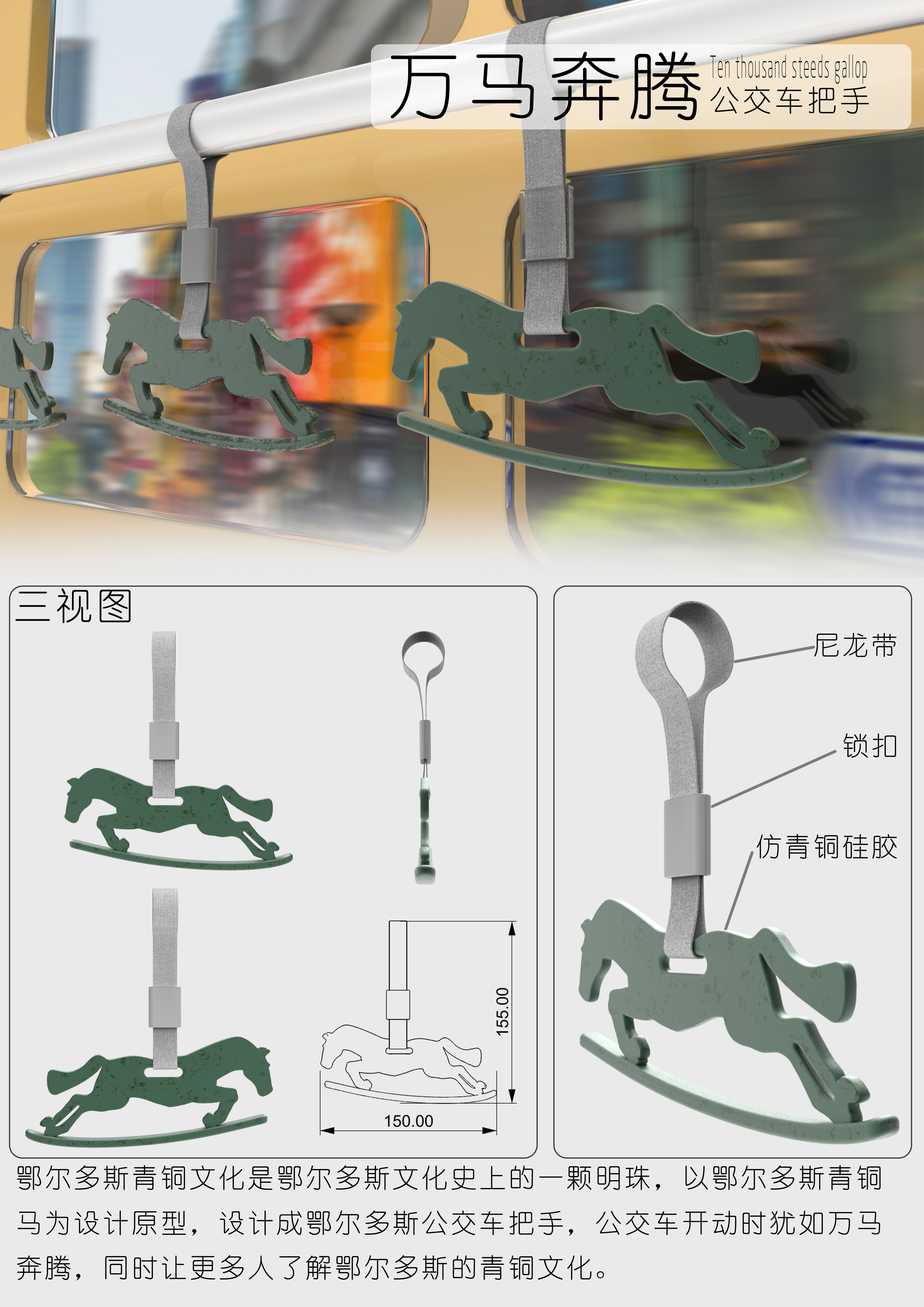 設(shè)計(jì)理念:鄂爾多斯青銅文化是鄂爾多斯文化史上的一顆明珠,以鄂爾多斯青銅馬為設(shè)計(jì)原型,設(shè)計(jì)成鄂爾多斯公交車(chē)把手,公交車(chē)開(kāi)動(dòng)時(shí)猶如萬(wàn)馬奔騰,同時(shí)讓更多人了解鄂爾多斯的青銅文化。