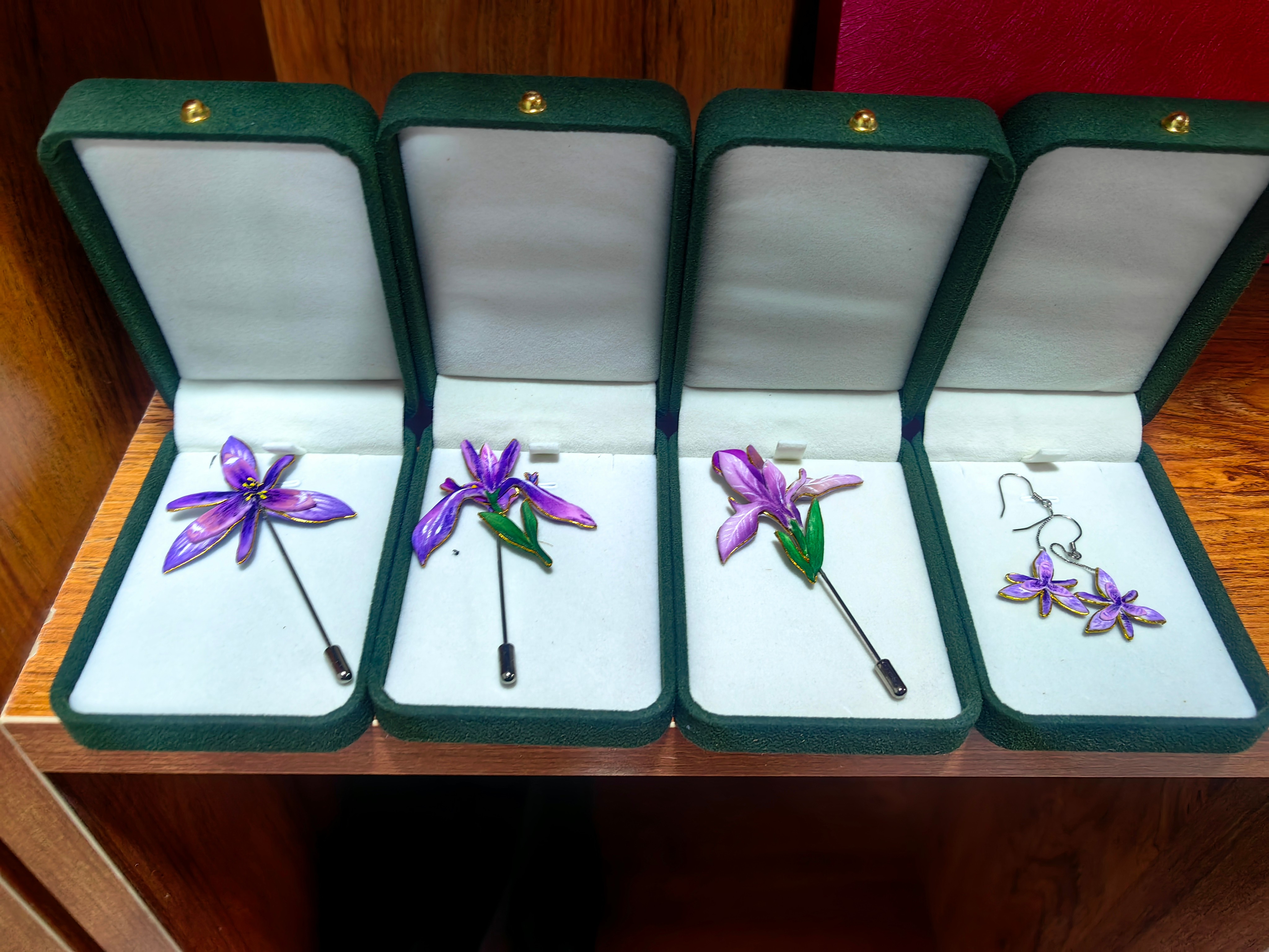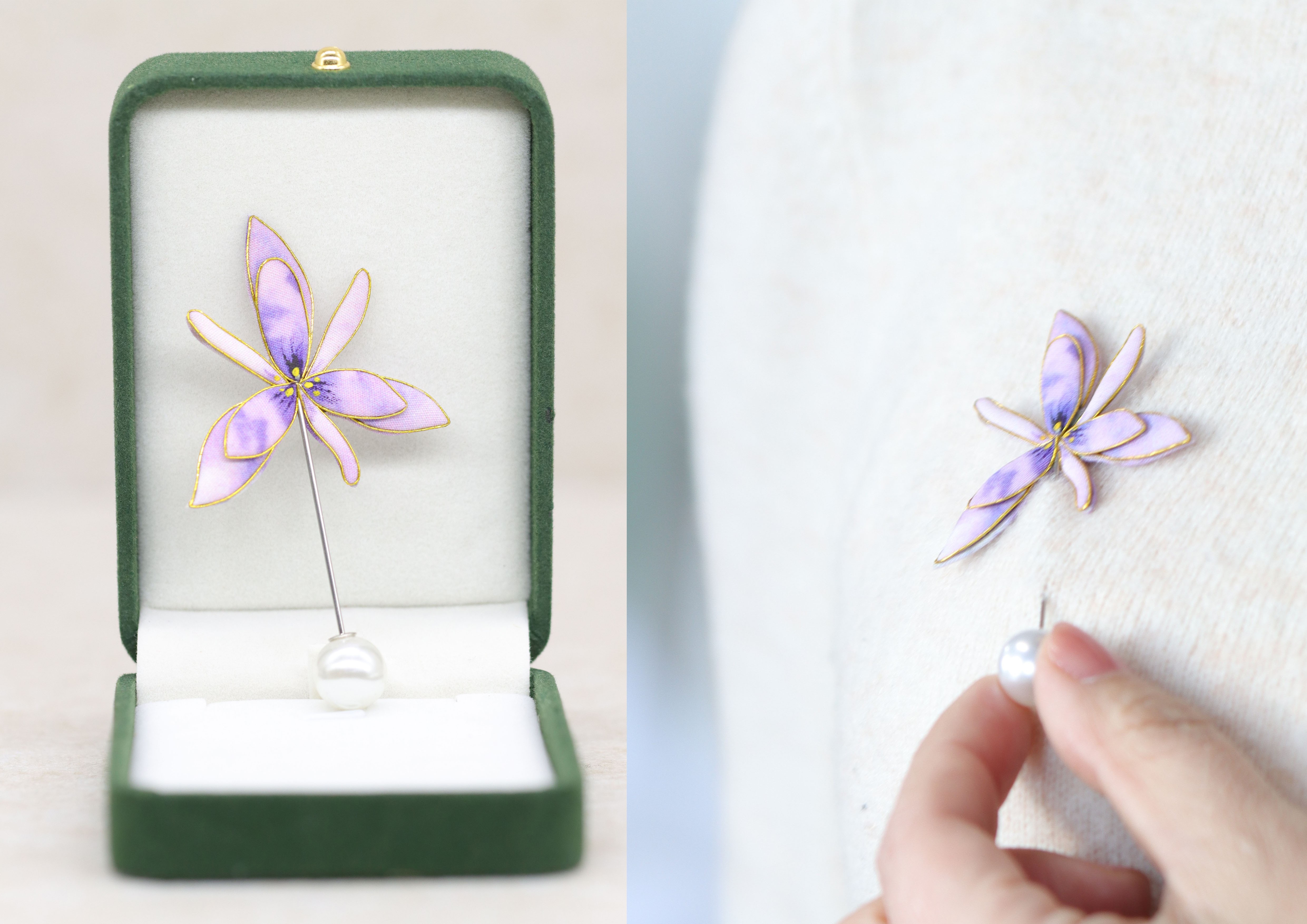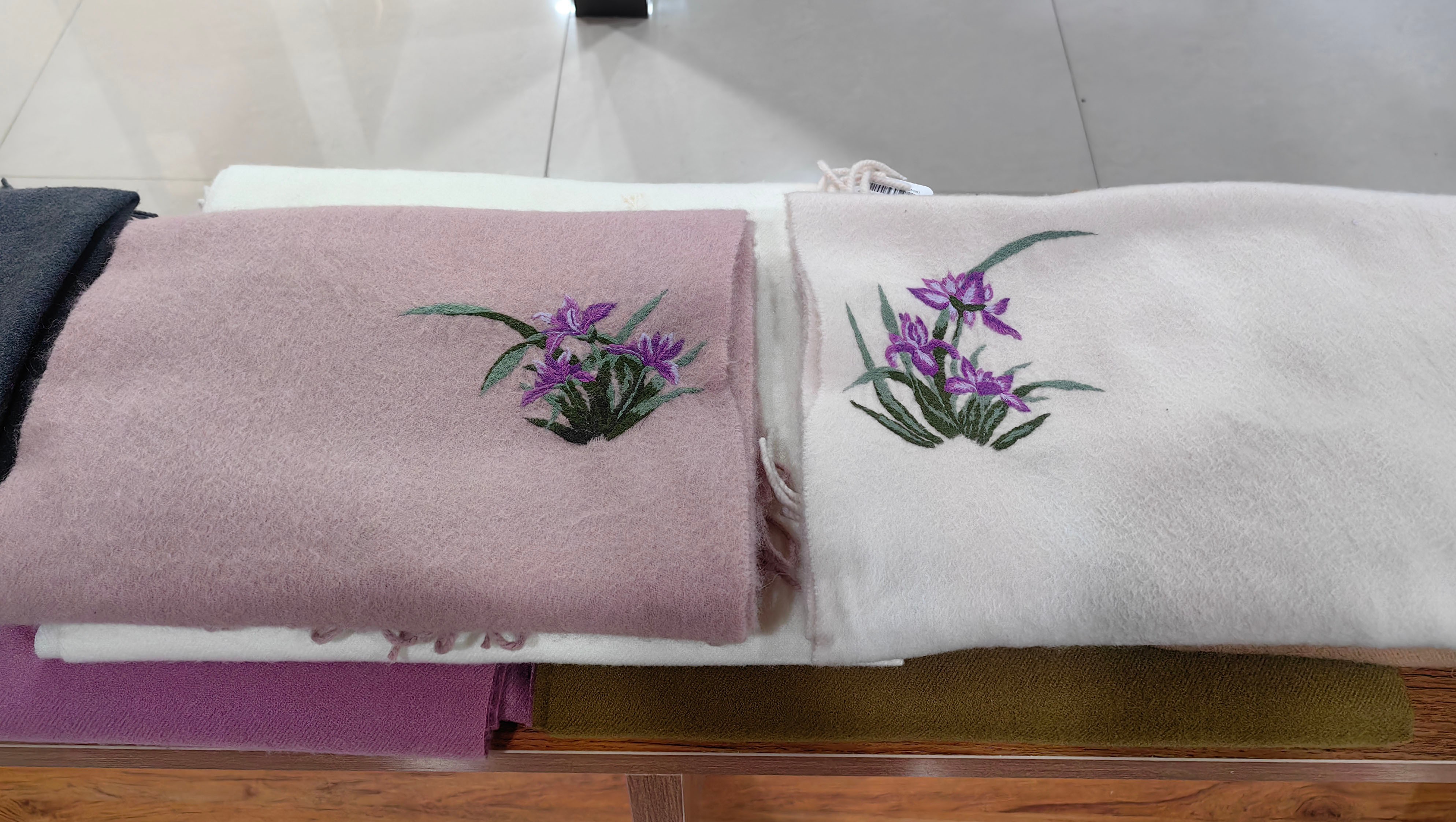 創(chuàng)作思路:馬蘭花系列文創(chuàng)產(chǎn)品圖案源于鄂爾多斯市的市花“馬蘭花”,通過設(shè)計(jì)提取了花朵元素制作成為胸針和耳飾、羊絨刺繡圍巾,胸針是采用側(cè)面的馬蘭花形象,耳飾是采用花朵正面的形象,圍巾是一簇馬蘭花形象,經(jīng)過手工制作成為胸針和耳飾產(chǎn)品,羊絨圍巾也是采用多種刺繡針法刺繡而成。